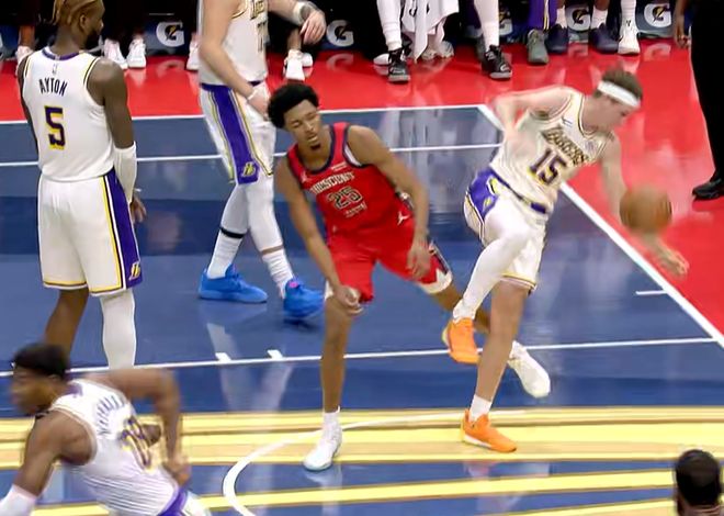 次节回来,霍金斯和贝互相助攻命中三分,鹈鹕将分差缩小至2分。里夫斯突破空中与奎因对抗后出手造犯规,鹈鹕主帅忍无可忍,满面怒容选择挑战最终成功改判,今天裁判确实抢戏。东契奇弧顶迎着防守三分命中,投进本场首个运动战进球,接着保护篮板后送出超远四分卫精准长传,拉拉维亚接球一打零轻松扣篮得手,湖人重新领先到7分。琼斯和阿尔瓦拉多连续三分打铁,东契奇持球反击,追身三分干拔再中,次节已砍下13分。东契奇突破摆脱包夹,助攻艾顿完成空接双手扣篮,半场战罢,湖人65-52领先鹈鹕13分。