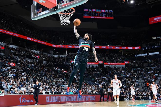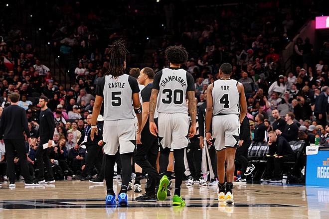 本场比赛中,马刺的先发锋线大将朱利安-尚帕尼(Julian Champagnie)的表现算得上是令人刮目相看。尚帕尼全场出场28分39秒,投篮7中4,三分线外6中3,得到了11分5篮板4助攻2抢断1盖帽的数据,正负值为+29。尚帕尼的出手次数其实并不多,但是他还是展现出了相当不错的投射能力,他也是抓住了有限的机会得到了不少分数,他甚至还展现出了不俗的传球能力和策应能力,这样的表现也是远远超出大家的预期的。尚帕尼在防守端的表现同样是可圈可点的,他的个人防守能力同样是非常突出的水平,同样是能够起到关键的作用的。不夸张地说,以尚帕尼在本场比赛中的表现,说他是一名顶级3D锋线球员,都是毫不为过的。
